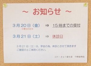 20日(春分の日)は15時まで受付しております。